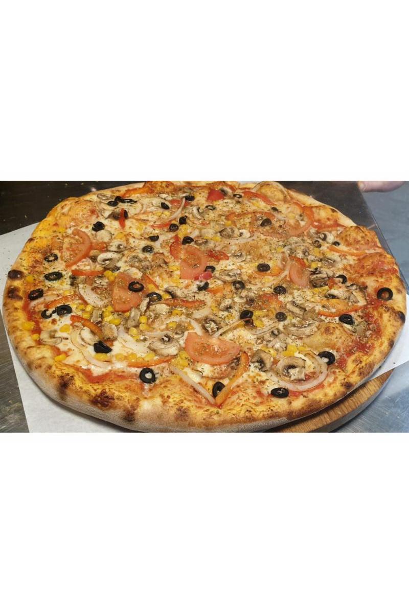 Tomatsaus, ost, oliven, ananas, løk, champignon, paprika, mais, friske tomater