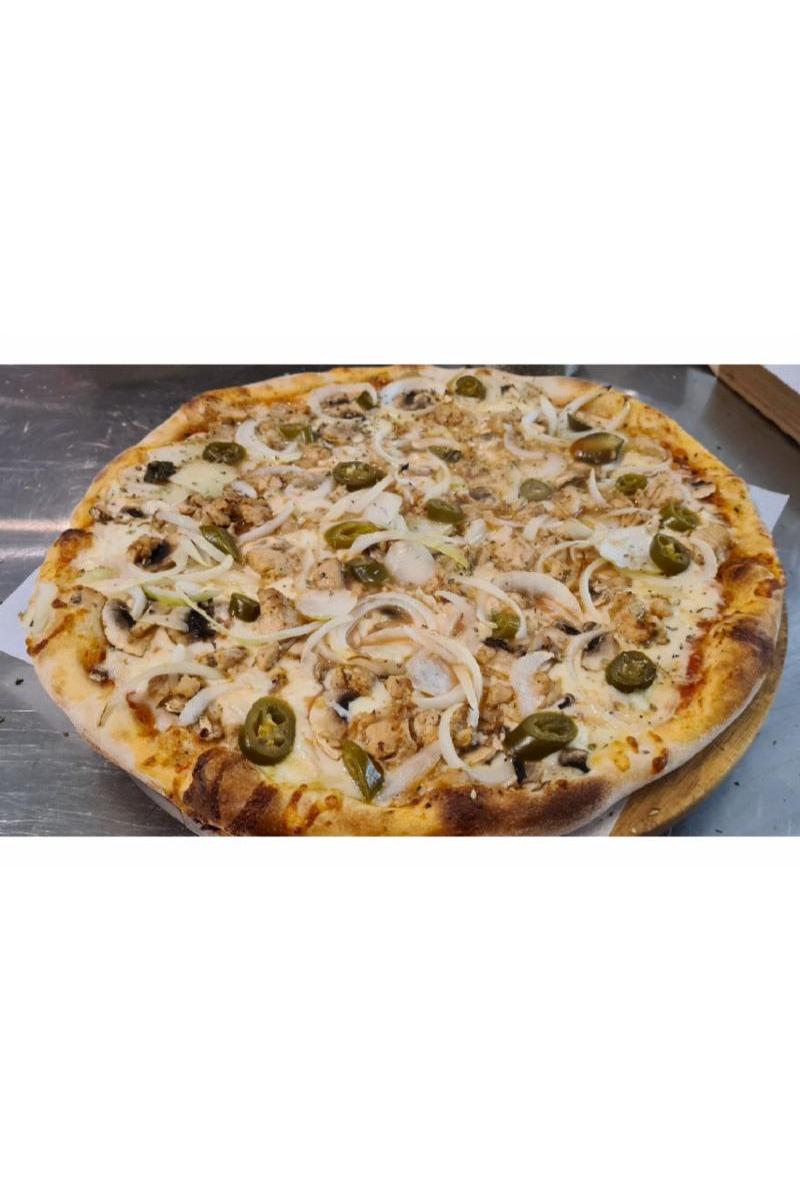 Tomatsaus, ost, kylling, champignon, løk, jalapenos