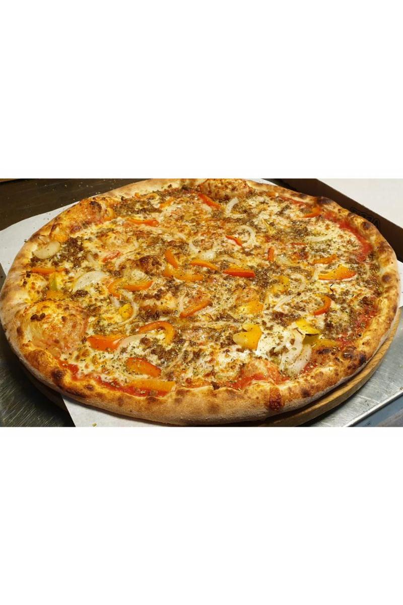 Tomatsaus, ost, kjøttdeig, paprika, løk