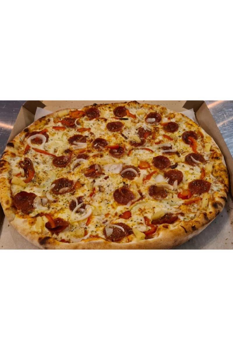 Tomatsaus, ost, pepperoni, paprika, ananas, løk