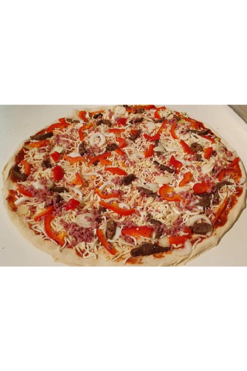 Tomatsaus, ost, biff, løk, bacon, paprika