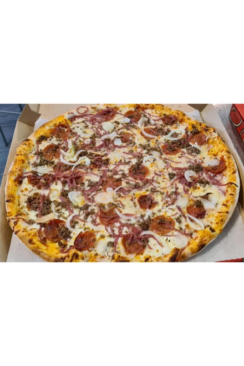Tomatsaus, ost, pepperoni, skinke, kjøttdeig, løk